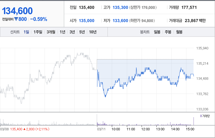 삼성전기의 현재 주가는 135,400원이며 전일 대비 -2.45원의 변동을 보이고 있습니다. 삼성전기의 대주주는 삼성전자(외 5인)로서 지분의 23.83%를 소유하고 있습니다. 이 회사는 전자 장비 및 기기 기업으로 분류되며, 현재 주가는 135,400원입니다. 시가 총액은 10조538억 원이고, 발행 주식수는 74,693,696주입니다. 외국인 보유 비중은 30.38%이며, 장중 거래량은 346,422주를 기록했습니다. 삼성전기의 매출액은 89,094억 원입니다.
