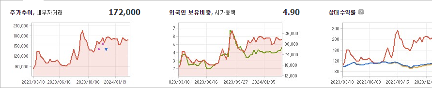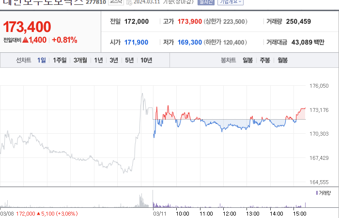 레인보우로보틱스의 현재 주가는 172,000원이며 전일 대비 -18.87원 하락하였습니다. 주주 구성을 살펴보면, 오준호(외 7인)이 지분의 58.79%를 소유하고 있습니다. 레인보우로보틱스는 기계 기업으로, 현재 주식 시장에서의 주가는 172,000원입니다. 시가 총액은 3조3639억 원이며, 발행 주식수는 19,399,858주입니다. 외국인 보유 비중은 4.90%이고, 장중 거래량은 418,230주를 기록했습니다. 레인보우로보틱스의 매출액은 105억 원입니다.
