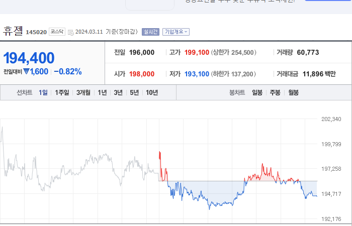휴젤은 현재 주가가 196,000원이며 전일 대비 -3,800원으로 하락하고 있습니다. 주주현황을 살펴보면 휴젤은 지분의 44.58%를 소유하고 있습니다. 이 회사는 바이오 기업으로 주가는 196,000원이고 시가 총액은 2조3355억 원입니다. 발행 주식수는 12,013,892주이며 외국인 보유 비중은 59.54%입니다. 장중 거래량은 61,370주입니다. 또한, 휴젤은 매출액으로 2,308억 원을 달성했습니다.