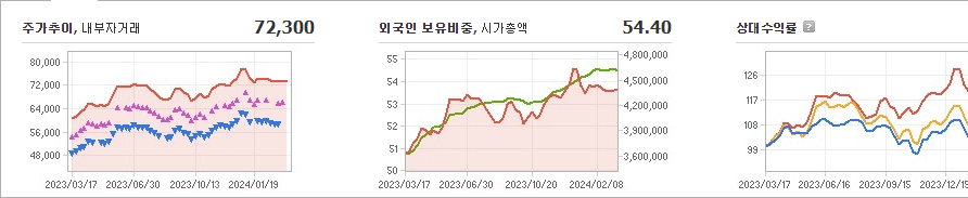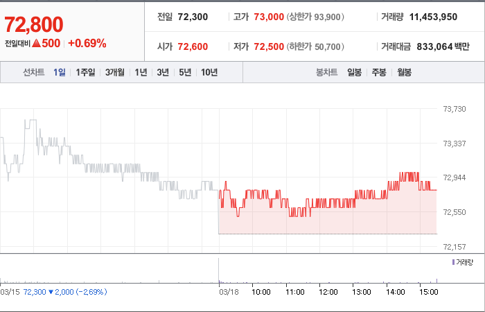 삼성전자의 현재 주가는 72,300원이며 전일 대비 -2,000원으로 하락하였습니다. 주주현황을 살펴보면 지분의 20.19%를 소유하고 있습니다. 삼성전자는 반도체 및 관련 장비 기업으로서, 현재 주가는 72,300원이며 시가 총액은 434조 6002억 원입니다. 발행 주식수는 5,969,782,550주이며 외국인 보유 비중은 54.40%입니다. 장중 거래량은 22,580,555주이며 매출액은 2,589,355억 원입니다.