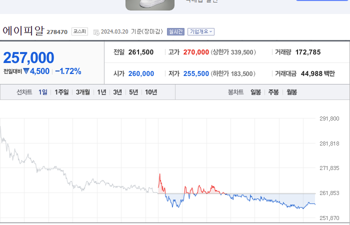 에이피알은 개인생활용품 기업으로, 현재 주가는 261,500원입니다. 전일 대비로 -25,500원 하락한 상태입니다. 김병훈(외 1인)은 에이피알의 주주로서 지분 34.16%를 소유하고 있습니다. 에이피알의 시가 총액은 1조9492억 원이며, 발행 주식수는 7,584,378주입니다. 외국인 보유 비중은 2.82%이며, 장중 거래량은 304,746주를 기록했습니다. 또한, 에이피알은 매출액으로 3,718억 원을 달성했습니다.