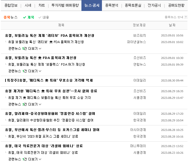 -2023년 3월 전년동기 대비 연결기준 매출액은 4.4% 증가, 영업이익은 24.9% 감소, 당기순이익은 9.3% 증가. 주력제품인 톡신은 국내 시장 지배력을 공고히 하고, 중국 시장에 성공적으로 진출하여 매출 상승세를 유지함. HA필러 또한 국내시장의 높은 시장점유율을 유지하고 있으며, ROW 국가에서의 성장을 이어감. 식약처로부터 리도카인 함유 액상 보툴리눔 톡신 제제(HG102) 임상 3상 시험계획을 승인 받음.