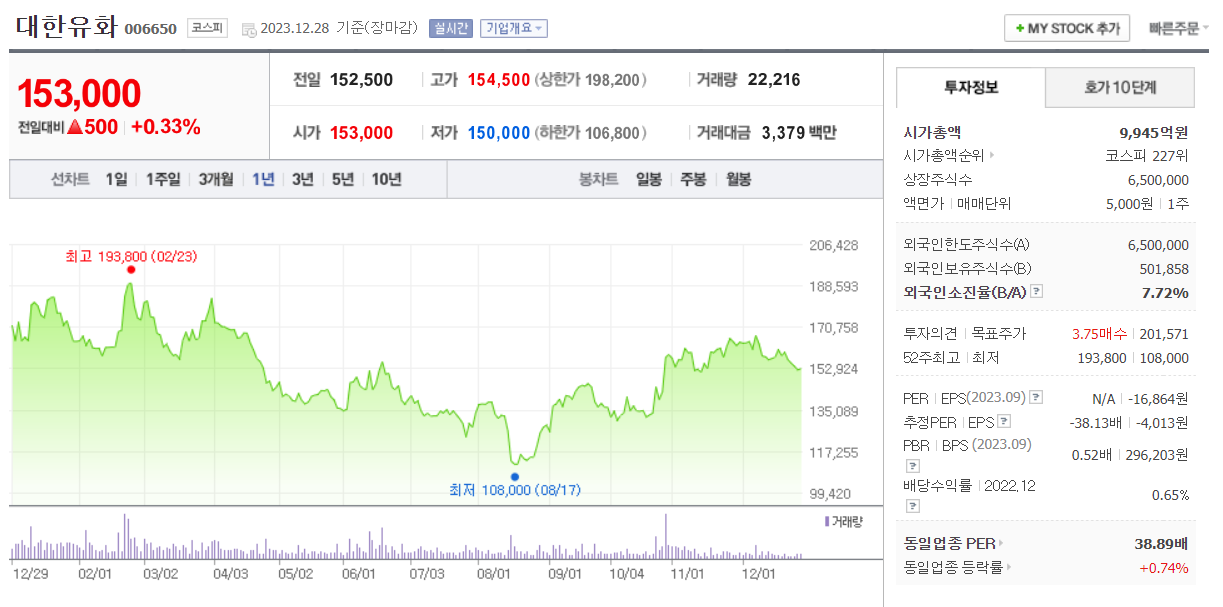 대한유화 현재 주가는 153,000원이며 전일 대비 -7.05원의 모습을 보이고 있습니다. 대한유화의 주주현황을 살펴보면 이순규(외 17인)이 지분 39.22%를 소유하고 있습니다. 대한유화는 화학 기업으로 장중 기준으로 주가는 153,000원 입니다. 대한유화의 시가 총액은 9945억 원이며 발행 주식수는 7.64주 입니다. 외국인 보유 비중은 22,225% 이며 장중 거래량은 6,500,000를 기록했습니다. 매출액은 18,281억 원, 영업이익은 -2,146억 원을 달성했습니다. EPS는 -4,587원이며 대한유화 주식 배당수익률은 0.58% 입니다.