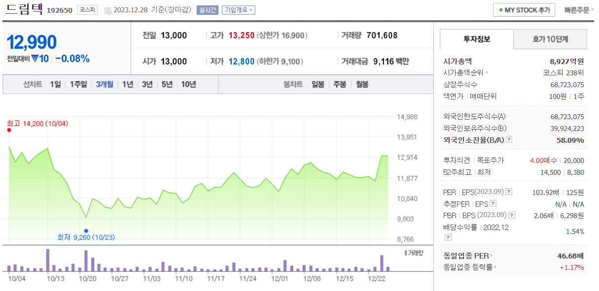 이 글에서는 드림텍 주가 전망과 목표 주가, 기업 정보에 대해서 설명합니다. 주식 시장에서 중요한 것은 미래의 기업 가치를 예측하고 선제적으로 움직이는 것입니다. 투자할 종목을 고르기 전에 현재 기업의 현황과 데이터를 확인하는 것이 필요합니다. 드림텍 주식의 주요 현황과 투자 정보를 확인하시고 주식 투자에 도움을 줄 자료들을 모아 두었으니 투자에 도움을 받으시길 바랍니다..