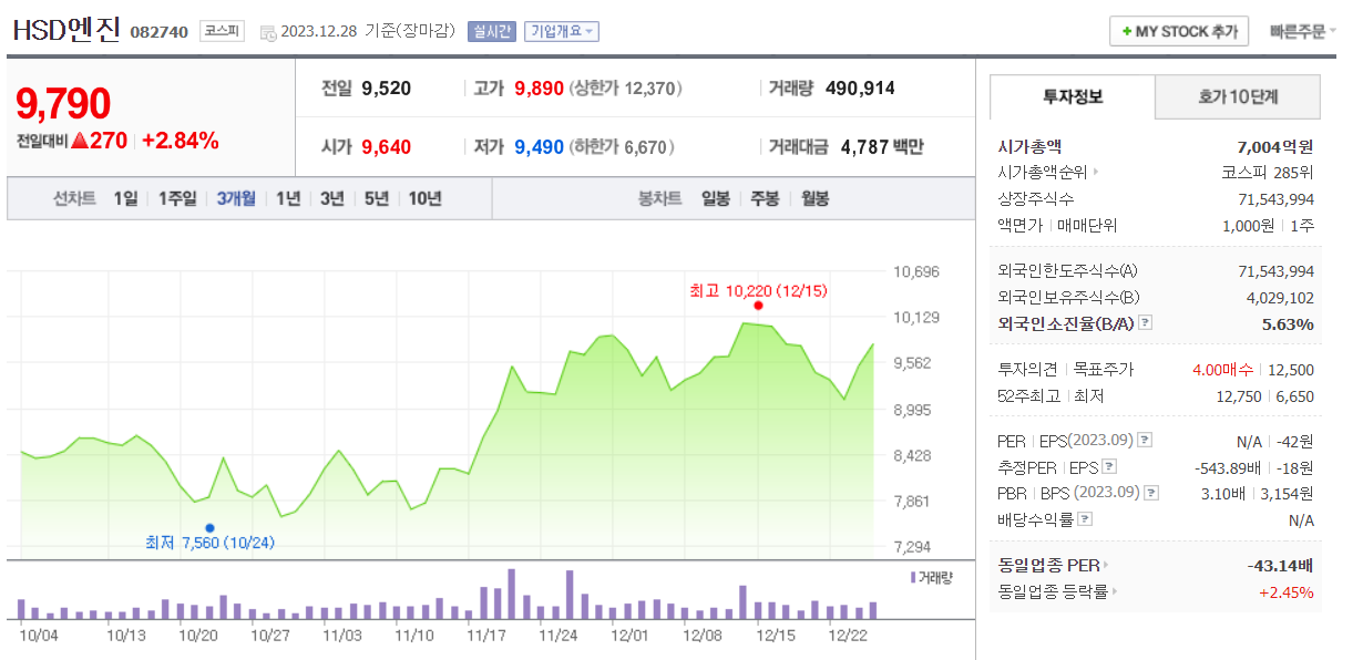 HSD엔진 현재 주가는 9,790원이며 전일 대비 -2.30원의 모습을 보이고 있습니다. HSD엔진의 주주현황을 살펴보면 인화정공(외 2인)이 지분 33.24%를 소유하고 있습니다. HSD엔진는 조선 기업으로 장중 기준으로 주가는 9,790원 입니다. HSD엔진의 시가 총액은 7004억 원이며 발행 주식수는 5.65주 입니다. 외국인 보유 비중은 491,323% 이며 장중 거래량은 71,543,994를 기록했습니다. 매출액은 5,760억 원, 영업이익은 -280억 원을 달성했습니다. EPS는 -18원이며 HSD엔진 주식 배당수익률은 % 입니다.