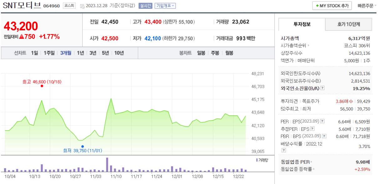 SNT모티브 현재 주가는 43,200원이며 전일 대비 -1.14원의 모습을 보이고 있습니다. SNT모티브의 주주현황을 살펴보면 S&T홀딩스(외 1인)이 지분 41.10%를 소유하고 있습니다. SNT모티브는 자동차부품 기업으로 장중 기준으로 주가는 43,200원 입니다. SNT모티브의 시가 총액은 6317억 원이며 발행 주식수는 19.30주 입니다. 외국인 보유 비중은 23,067% 이며 장중 거래량은 14,623,136를 기록했습니다. 매출액은 8,515억 원, 영업이익은 1,119억 원을 달성했습니다. EPS는 7,710원이며 SNT모티브 주식 배당수익률은 0.83% 입니다.