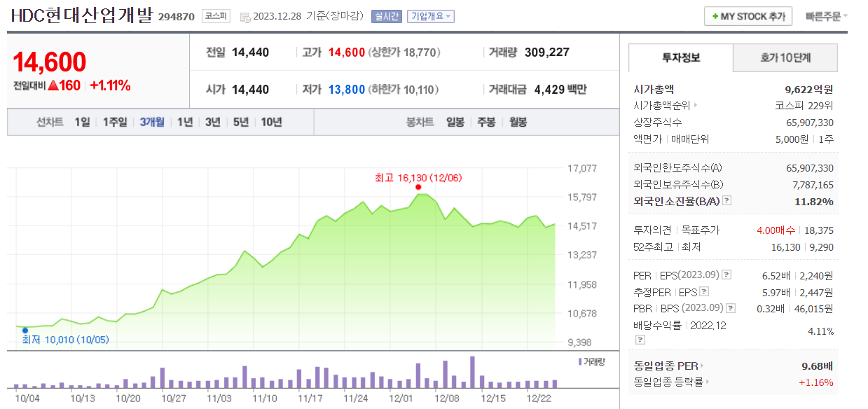 HDC현대산업개발 현재 주가는 14,600원이며 전일 대비 -6.35원의 모습을 보이고 있습니다. HDC현대산업개발의 주주현황을 살펴보면 HDC(외 7인)이 지분 43.01%를 소유하고 있습니다. HDC현대산업개발는 건설 기업으로 장중 기준으로 주가는 14,600원 입니다. HDC현대산업개발의 시가 총액은 9622억 원이며 발행 주식수는 11.89주 입니다. 외국인 보유 비중은 310,148% 이며 장중 거래량은 65,907,330를 기록했습니다. 매출액은 30,417억 원, 영업이익은 1,164억 원을 달성했습니다. EPS는 2,447원이며 HDC현대산업개발 주식 배당수익률은 6.00% 입니다.