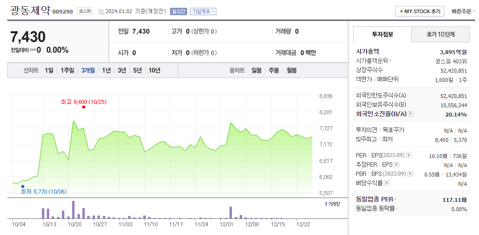 광동제약 현재 주가는 7,430원이며 전일 대비 원의 모습을 보이고 있습니다. 광동제약의 주주현황을 살펴보면 최성원(외 14인)이 지분 23.54%를 소유하고 있습니다. 광동제약는 제약 기업으로 장중 기준으로 주가는 7,430원 입니다. 광동제약의 시가 총액은 3895억 원이며 발행 주식수는 20.12주 입니다. 외국인 보유 비중은 189,000% 이며 장중 거래량은 52,420,851를 기록했습니다. 매출액은 11,301억 원, 영업이익은 382억 원을 달성했습니다. EPS는 없음원이며 광동제약 주식 배당수익률은 0.85% 입니다.