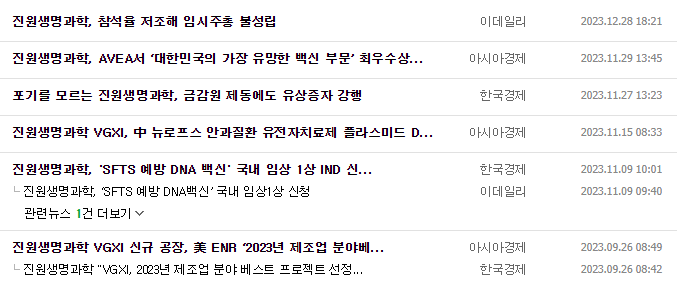 -2023년 9월 전년동기 대비 연결기준 매출액은 29.4% 감소, 영업손실은 58.5% 증가, 당기순손실은 61.6% 증가. 3분기 매출이 소폭 회복되었으나, 전년동기대비 매출은 감소세. 운영자금 확보 및 자본구조 개선을 위해 2023년 7월 13일 유무상증자 진행. 2023년 11월 100% 자회사인 VGXI, Inc.의 신규차입을 위해 98억 규모의 채무보증을 결정하였음.