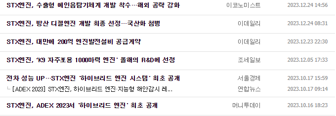 -2023년 9월 전년동기 대비 연결기준 매출액은 18.3% 증가, 영업이익은 674.1% 증가, 당기순손실은 87% 감소. 해상 엔진 사업의 성장에 따라 전반적인 매출상승과 영업이익이 상승하였고 이에 따라 성장가도를 달리고 있음 동사는 Dual Fuel, Gas 엔진 등의 성공적인 개발과, 다양한 국책과제의 수행을 통해 시장 트렌드에 맞는 친환경 제품 개발을 통해 대응하고 있음.