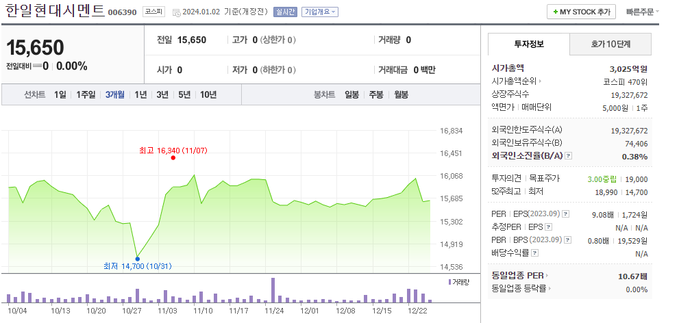이 글에서는 한일현대시멘트 주가 전망과 목표 주가, 기업 정보에 대해서 설명합니다. 주식 시장에서 중요한 것은 미래의 기업 가치를 예측하고 선제적으로 움직이는 것입니다. 투자할 종목을 고르기 전에 현재 기업의 현황과 데이터를 확인하는 것이 필요합니다. 한일현대시멘트 주식의 주요 현황과 투자 정보를 확인하시고 주식 투자에 도움이 될 만한 정보들을 모아 놓았으니 투자를 고려하실 때 참고하세요..