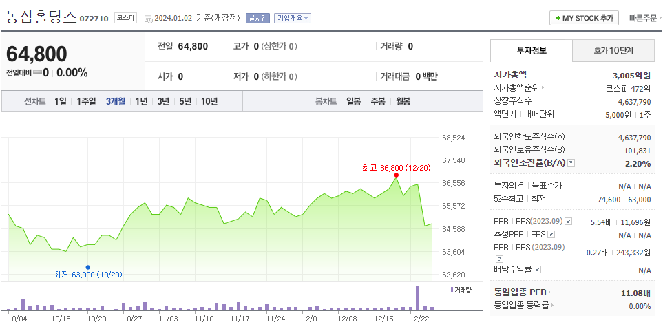 농심홀딩스 현재 주가는 64,800원이며 전일 대비 -1.07원의 모습을 보이고 있습니다. 농심홀딩스의 주주현황을 살펴보면 신동원(외 17인)이 지분 66.70%를 소유하고 있습니다. 농심홀딩스는 식료품 기업으로 장중 기준으로 주가는 64,800원 입니다. 농심홀딩스의 시가 총액은 3005억 원이며 발행 주식수는 2.20주 입니다. 외국인 보유 비중은 5,003% 이며 장중 거래량은 4,637,790를 기록했습니다. 매출액은 5,359억 원, 영업이익은 528억 원을 달성했습니다. EPS는 없음원이며 농심홀딩스 주식 배당수익률은 3.26% 입니다.