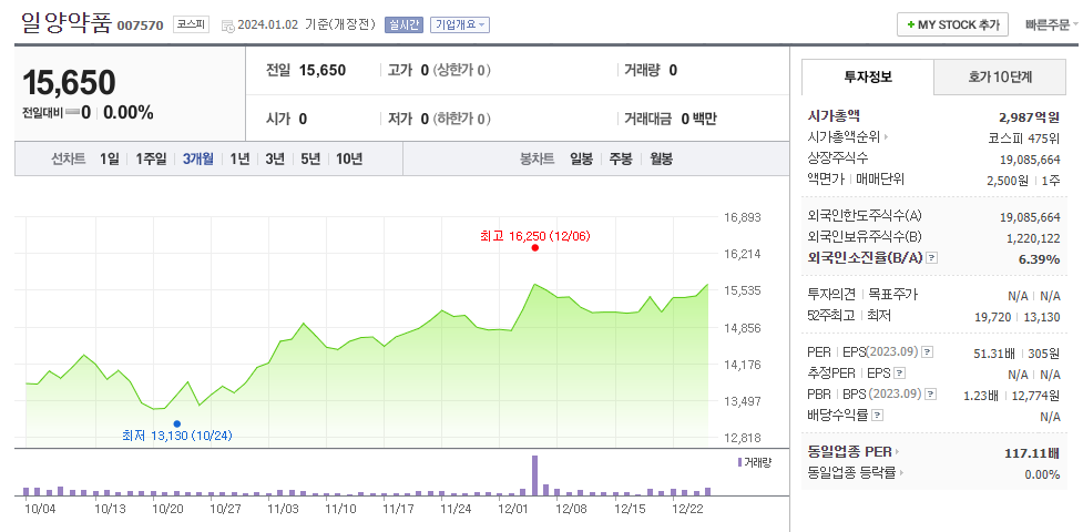 일양약품 현재 주가는 15,650원이며 전일 대비 -8.85원의 모습을 보이고 있습니다. 일양약품의 주주현황을 살펴보면 정도언(외 6인)이 지분 26.52%를 소유하고 있습니다. 일양약품는 제약 기업으로 장중 기준으로 주가는 15,650원 입니다. 일양약품의 시가 총액은 2987억 원이며 발행 주식수는 6.39주 입니다. 외국인 보유 비중은 52,164% 이며 장중 거래량은 19,085,664를 기록했습니다. 매출액은 2,663억 원, 영업이익은 404억 원을 달성했습니다.