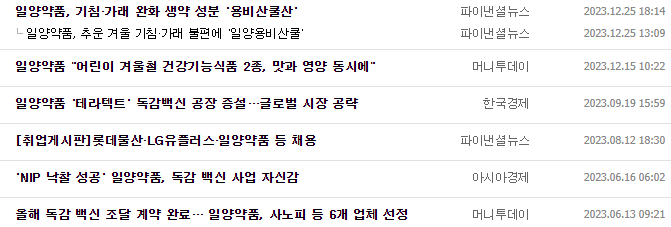 -2023년 9월 전년동기 대비 연결기준 매출액은 5.8% 감소, 영업이익은 53.7% 감소, 당기순이익은 73.3% 감소. 동사의 2023년 3분기 실적은 당기부터 통화일양보건품유한공사의 합자청산 결정으로 연결재무제표에서 제외된 것이 전년 동기와 대비하여 매출액 및 영업이익 등 경영실적의 주된 감소 원인임. 시장 확대를 목적으로 WHO PQ (WHO 적격업체) 승인을 완료함.