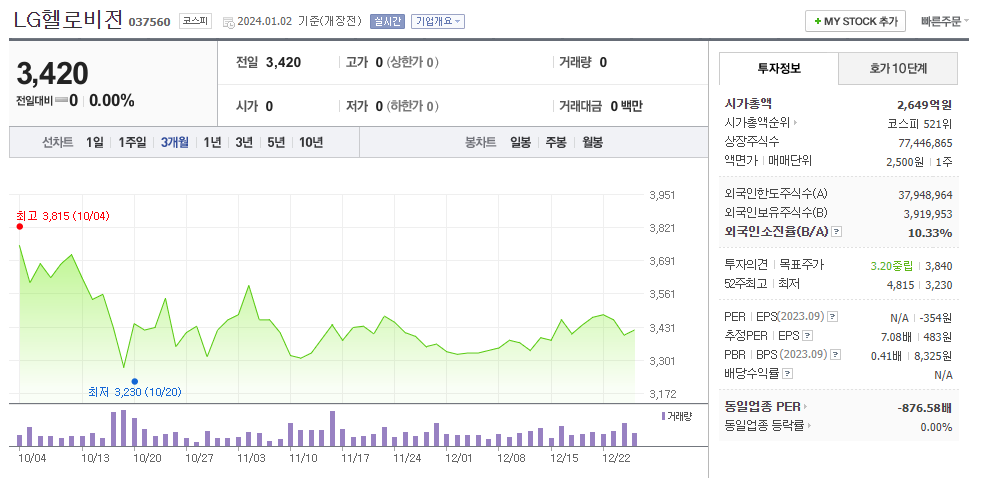 LG헬로비전 현재 주가는 3,420원이며 전일 대비 -9.52원의 모습을 보이고 있습니다. LG헬로비전의 주주현황을 살펴보면 이 지분 50.00%를 소유하고 있습니다. LG헬로비전는 미디어 기업으로 장중 기준으로 주가는 3,420원 입니다. LG헬로비전의 시가 총액은 2649억 원이며 발행 주식수는 5.06주 입니다. 외국인 보유 비중은 107,865% 이며 장중 거래량은 77,446,865를 기록했습니다. 매출액은 8,529억 원, 영업이익은 538억 원을 달성했습니다. EPS는 483원이며 LG헬로비전 주식 배당수익률은 2.73% 입니다.