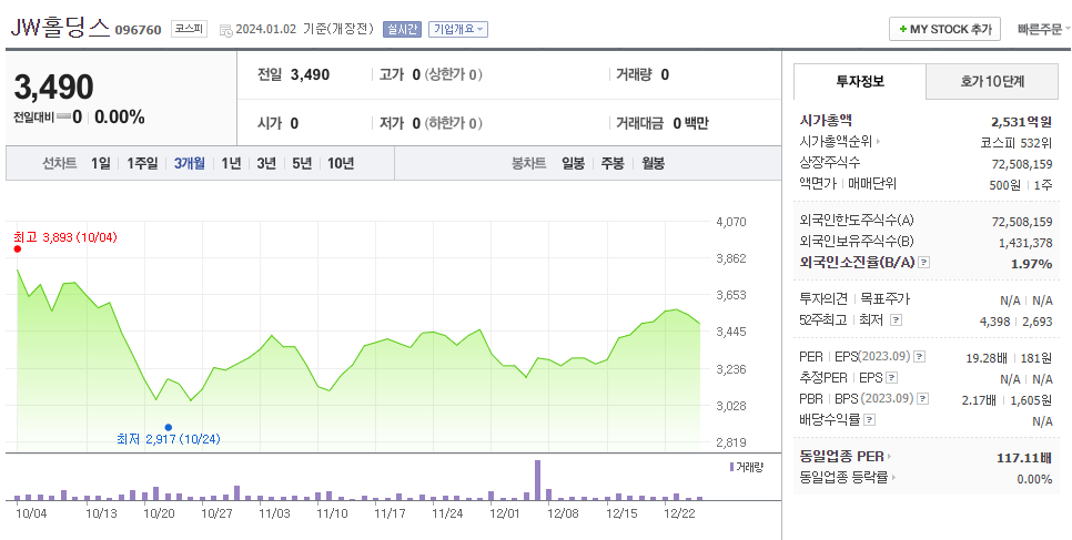 JW홀딩스 현재 주가는 3,490원이며 전일 대비 -50원의 모습을 보이고 있습니다. JW홀딩스의 주주현황을 살펴보면 이경하(외 16인)이 지분 51.19%를 소유하고 있습니다. JW홀딩스는 제약 기업으로 장중 기준으로 주가는 3,490원 입니다. JW홀딩스의 시가 총액은 2531억 원이며 발행 주식수는 1.97주 입니다. 외국인 보유 비중은 38,031% 이며 장중 거래량은 72,508,159를 기록했습니다. 매출액은 6,665억 원, 영업이익은 1,033억 원을 달성했습니다. EPS는 없음원이며 JW홀딩스 주식 배당수익률은 4.97% 입니다.