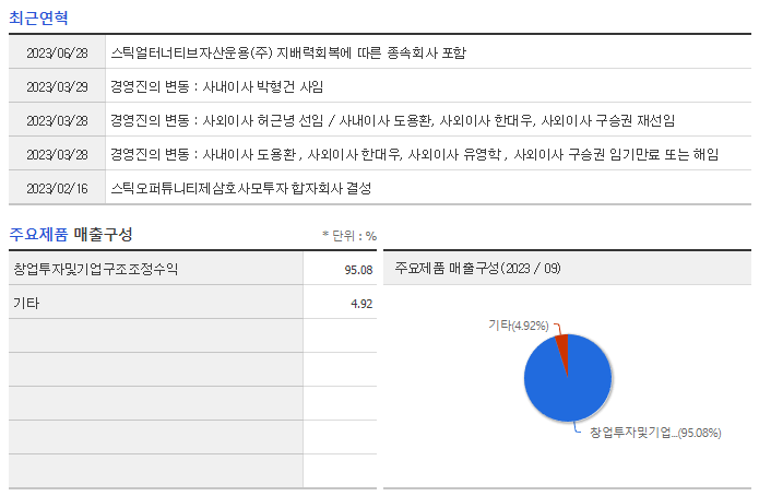 -2023년 9월 전년동기 대비 연결기준 매출액은 5.2% 감소, 영업이익은 38.5% 증가, 당기순이익은 6.6% 감소. 1999년 벤처캐피탈로 출발한 동사의 벤처조합/펀드 누적약정액이 2023년 9월 말까지 1조 8,100억원에 달함. 2006년 역외 PEF설립으로 시작한 사모펀드의 누적약정액은 2023년 9월 말 8.3조원을기록하는 등 두 부문에서 모두 큰 성장세를 시현하였음.