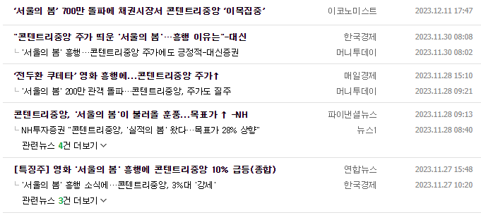 -2023년 9월 전년동기 대비 연결기준 매출액은 21.4% 증가, 영업손실은 66.3% 감소, 당기순손실은 131.9% 증가. 영화 '서울의 봄'이 흥행몰이를 하면서 투자·배급을 담당한 동사의 매출 증대가 기대되고 있음. 작가 파업과 배우 파업 종료로 2024년부터는 동사의 제작이 정상화할 전망이며 공급 작품은 2023년 두 편 대비 증가한 4편이 될 전망임.