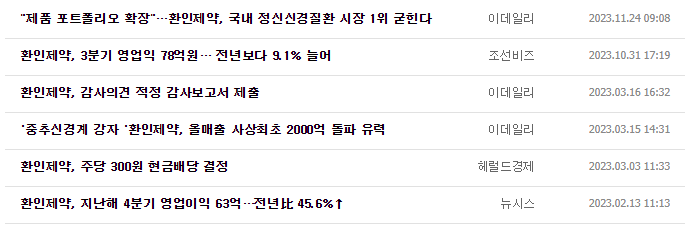 -2023년 9월 전년동기 대비 연결기준 매출액은 17.2% 증가, 영업이익은 0.7% 증가, 당기순이익은 19% 증가. 동사의 리페르돈과 쿠에타핀 등의 정신신경용제 매출이 1307억원을 기록하고 이미그란정 등 해열 및 진통제의 매출 또한 증가하였음. 매출액이 전년동기 대비 17% 증가했음에도 불구하고 기타 국내 원재료가 10,712백만원이 소요되는 등 전년동기대비 원가율이 악화되어 영업이익에 가시적인 성과를 보이지 못함.