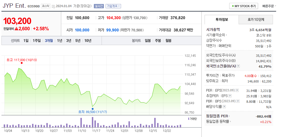 JYP Ent. 현재 주가는 100,600원이며 전일 대비 -800원의 모습을 보이고 있습니다. JYP Ent.의 주주현황을 살펴보면 박진영(외 3인)이 지분 15.78%를 소유하고 있습니다. JYP Ent.는 미디어 기업으로 장중 기준으로 주가는 100,600원 입니다. JYP Ent.의 시가 총액은 3조6654억 원이며 발행 주식수는 41.79주 입니다. 외국인 보유 비중은 304,238% 이며 장중 거래량은 35,517,492를 기록했습니다. 매출액은 4,094억 원, 영업이익은 966억 원을 달성했습니다. EPS는 3,981원이며 JYP Ent. 주식 배당수익률은 35,731% 입니다.