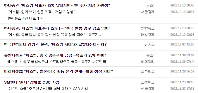 -2023년 9월 전년동기 대비 연결기준 매출액은 19.9% 증가, 영업이익은 52.8% 증가, 당기순이익은 67.1% 증가. 경쟁 업체 대비 중국 노출도 큰 점도 부담이지만, 신규 런칭 예정된 그룹(NCT NEW TEAM, 걸그룹 1팀, 가상 아이돌 1팀)의 신규 앨범 판매량이 부진을 일부 상쇄할 전망임. 카카오엔터테인먼트 합작 북미 현지 법인 설립으로 주요 아티스트의 미국 활동도 본격적으로 전개될 예정임.