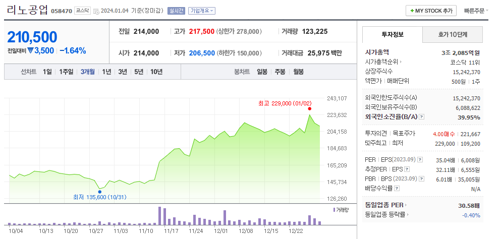 리노공업 현재 주가는 214,000원이며 전일 대비 -9,500원의 모습을 보이고 있습니다. 리노공업의 주주현황을 살펴보면 베어링자산운용(외 3인)이 지분 34.66%를 소유하고 있습니다. 리노공업는 반도체 및 관련장비 기업으로 장중 기준으로 주가는 214,000원 입니다. 리노공업의 시가 총액은 3조2085억 원이며 발행 주식수는 40.01주 입니다. 외국인 보유 비중은 217,600% 이며 장중 거래량은 15,242,370를 기록했습니다. 매출액은 1,976억 원, 영업이익은 1,366억 원을 달성했습니다. EPS는 6,552원이며 리노공업 주식 배당수익률은 0.72% 입니다.