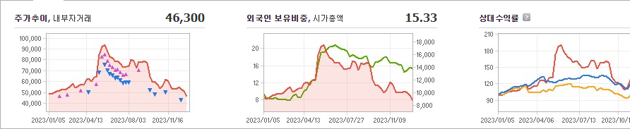 와이지엔터테인먼트는 현재 주가가 46,300원이며 전일 대비 -200원 하락하였습니다. 주주 현황을 살펴보면, 양현석(외 6인)이 지분의 24.81%를 소유하고 있습니다. 미디어 기업인 와이지엔터테인먼트의 시가 총액은 8559억 원이며, 발행 주식수는 18,687,169주입니다. 외국인의 보유 비중은 15.33%이며, 장중 거래량은 231,872주를 기록하였습니다. 또한, 매출액은 4,598억 원으로 달성되었습니다.