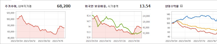 오늘 현재 CJ ENM 주가는 전일 대비 1,700원 하락한 68,200원을 기록하고 있습니다. 주주구조를 살펴보면, CJ는 다른 5인을 제외하면 42.70%의 상당한 지분을 보유하고 있습니다. CJ ENM은 미디어 산업을 영위하고 있으며, 현재 시가총액은 1조 5천억원, 총 유통주식수는 21,929,154주입니다. 외국인 지분은 13.54%이며, 당일 거래량은 103,571건입니다. 회사는 매출 31조870억원을 공시했다. 주가는 시장 변동에 따라 달라질 수 있으며, 제공되는 정보는 이용 가능한 최신 데이터를 기반으로 한다는 점을 참고하시기 바랍니다.