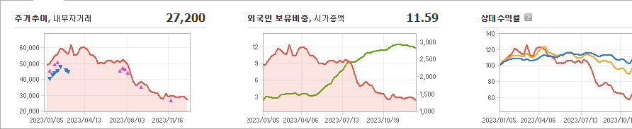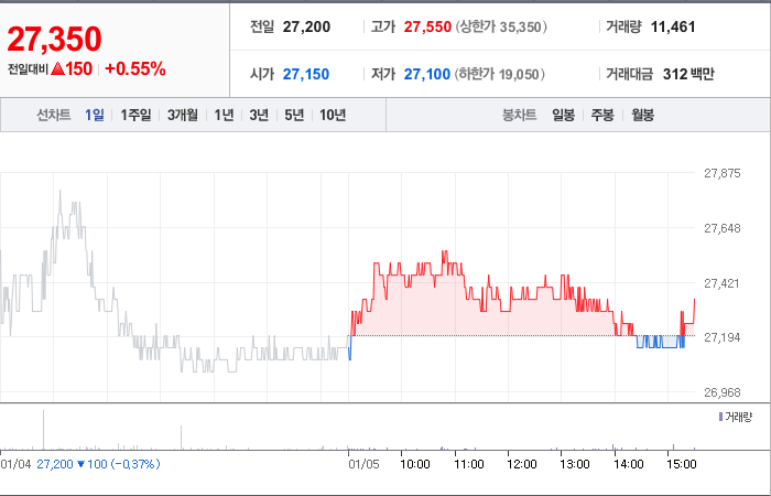 테이팩스의 주가는 현재 27,200원이며 전일 대비 -100원으로 하락한 상태입니다. 주주현황을 살펴보면, 한솔케미칼(외 2인)이 지분의 45.01%를 소유하고 있습니다. 또한, 테이팩스는 화학 기업으로서 장중 기준으로 주가는 27,200원으로 확인되었습니다. 시가총액은 1,303억 원이며, 발행 주식수는 4,764,650주입니다. 외국인 보유 비중은 11.59%이고, 장중 거래량은 28,252이었습니다. 마지막으로 매출액은 1,108억 원으로 기록되었습니다.