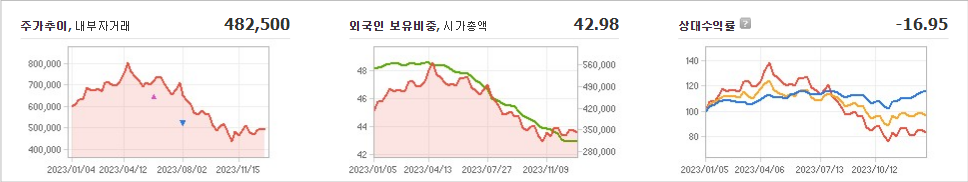 LG화학의 현재 주가는 482,500원으로, 전일 대비 -3.88원의 하락을 보여주고 있습니다. LG화학의 대주주는 LG(외 2인)이며, 지분은 33.37%입니다. 시가 총액은 34조608억 원이며, 발행 주식수는 70,592,343주입니다. 외국인 보유 비중은 42.98%이고, 장중 거래량은 131,560주입니다. LG화학은 화학 기업으로 매출액은 421,150억 원을 기록하였습니다.