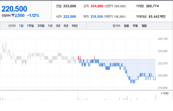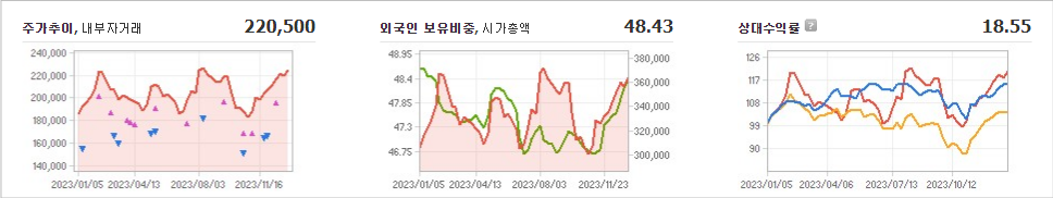 NAVER의 현재 주가는 220,500원이며 전일 대비 -2,500원의 하락세를 보였습니다. BlackRock Fund Advisors(외 13인)은 NAVER의 지분의 9.34%를 소유하고 있습니다. NAVER는 인터넷 서비스 기업으로, 현재 주가는 220,500원입니다. 시가 총액은 35조 8,111억 원이며 발행 주식수는 162,408,594주입니다. 외국인의 보유 비중은 48.43%이고, 장중 거래량은 387,884를 기록했습니다. 또한, NAVER는 매출액으로 71,336억 원을 달성했습니다.