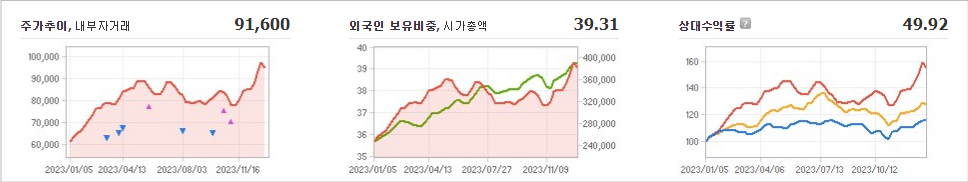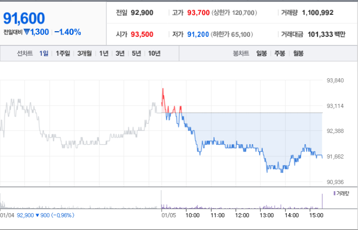 기아의 현재 주가는 91,600원이며 전일 대비 -1,300원 하락했습니다. 기아의 주주 구성은 현대자동차(외 4개 기관)이 35.92%의 지분을 보유하고 있습니다. 기아는 자동차 기업으로서 시장이 닫힌 시점에서 주가는 91,600원입니다. 기아의 시가 총액은 36조 8,272억 원이며, 발행된 주식의 수는 402,044,203주입니다. 외국인 보유 비중은 39.31%이며, 장 중 거래량은 1,110,042주입니다. 최근 기아는 매출액으로 754,803억 원을 기록했습니다.