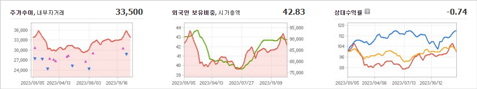 KT의 현재 주가는 33,500원이며, 전일 대비 -50원으로 하락하였습니다. KT의 주주구성을 살펴보면 현대자동차 및 외국인 보유 비중을 중심으로 형성되어 있습니다. 현대자동차는 지분 8.63%를 보유하고 있으며, 외국인 보유 비중은 42.83%입니다. KT의 시가 총액은 8조6383억 원이고, 발행 주식수는 257,860,760주입니다. 장중 거래량은 334,395주이며, 매출액은 196,886억 원입니다. KT는 무선통신 기업으로 알려져 있습니다.