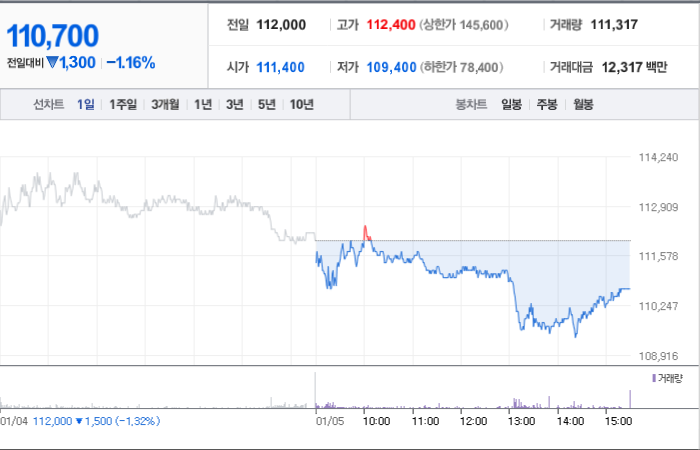 HD한국조선해양의 현재 주가는 110,700원이며 전일 대비 -1,300원 하락했습니다. 주요 주주로는 현대중공업지주(외 10인)이 지분의 36.66%를 소유하고 있습니다. HD한국조선해양은 조선 기업으로서 현재 주가는 110,700원이며 시가 총액은 7조8346억 원입니다. 총 발행 주식수는 70,773,116주이며 외국인 보유 비중은 26.28%입니다. 장중 거래량은 111,905주이며 매출액은 153,072억 원입니다.