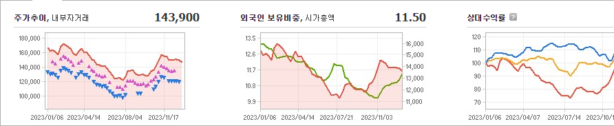 롯데칠성은 현재 주가가 143,900원이며 전일 대비 -3,900원의 하락세를 보여주고 있습니다. 롯데칠성의 대주주인 롯데지주(외 13인)은 지분 62.39%를 소유하고 있습니다. 이 회사는 음료 기업으로서 현재 주가는 143,900원이며 시가 총액은 1조3260억 원이고 주식 발행 수는 9,278,884주입니다. 외국인 보유 비중은 11.50%이며 장중 거래량은 10,188입니다. 또한 매출액은 23,063억 원입니다.