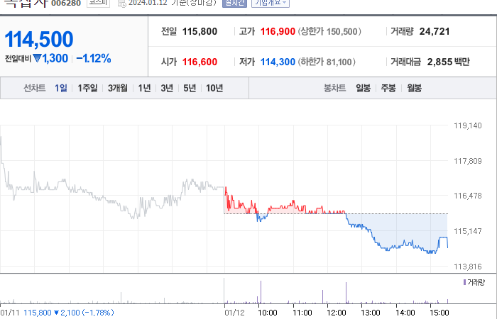 녹십자 주식의 현재 가격은 114,500원이며, 전일 대비로 1,300원 하락한 상태입니다. 주주 구성을 살펴보면, 녹십자홀딩스(외 9인)가 지분의 51.42%를 소유하고 있습니다. 녹십자는 제약 기업으로, 현재 주식 시가는 114,500원입니다. 총 발행 주식수는 11,686,538주이며, 시가 총액은 1조3381억 원입니다. 외국인 보유 비중은 17.77%이며, 장중 거래량은 24,741주를 기록했습니다. 녹십자의 매출액은 12,217억 원입니다.