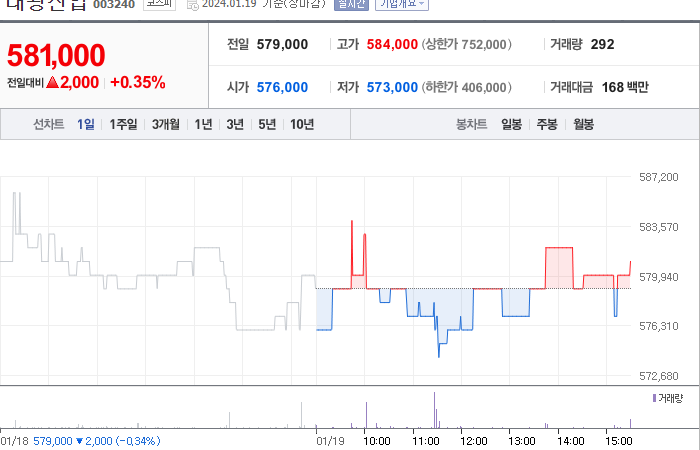 태광산업의 현재 주가는 581,000원이며, 전일 대비 -5.99원 하락하였습니다. 이호진(외 5인)은 태광산업의 주주로서 지분의 54.53%를 소유하고 있습니다. 태광산업은 화학 기업으로서, 장중 주가는 581,000원이고 시가 총액은 6469억 원입니다. 발행 주식수는 1,113,400주이며, 외국인 보유 비중은 4.99%입니다. 장중 거래량은 292주이며, 매출액은 17,658억 원입니다.