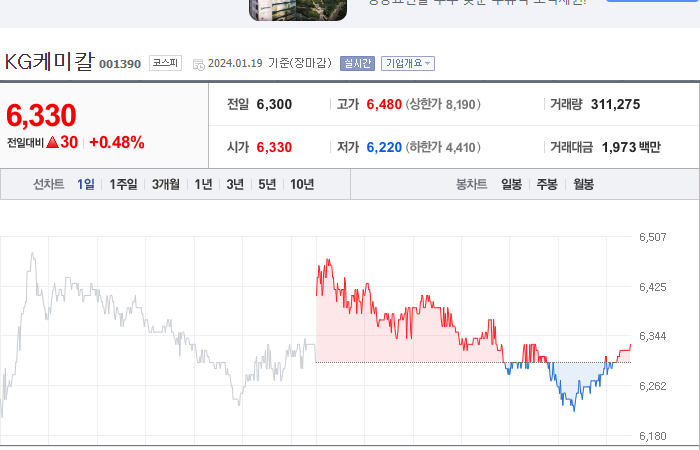 KG케미칼의 현재 주가는 6,330원이고, 전일 대비 -7.32원으로 하락하였습니다. 주주현황을 살펴보면, 곽재선(외 14인)이 지분의 50.93%를 소유하고 있습니다. KG케미칼은 금속 및 광물 기업으로, 현재 주가는 6,330원입니다. 시가 총액은 4,334억 원이며, 발행 주식수는 68,469,040주입니다. 외국인 보유 비중은 7.80%이며, 장중 거래량은 318,891주를 기록했습니다. 매출액은 69,320억 원입니다.