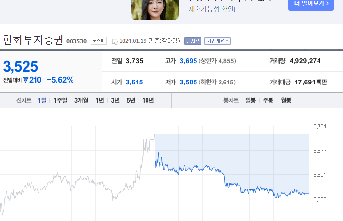 한화투자증권의 현재 주가는 3,525원이며 전일 대비 -210원의 변동을 보이고 있습니다. 한화투자증권의 주주 구성은 한화자산운용(외 2인)이 지분의 46.13%를 소유하고 있습니다. 시가 총액은 7563억 원이며 발행 주식수는 214,547,775주입니다. 외국인 보유 비중은 6.00%이고, 장중 거래량은 5,018,342주입니다. 또한, 한화투자증권의 매출액은 934억 원입니다.