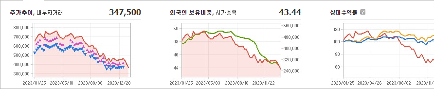 삼성SDI의 현재 주가는 347,500원이며 전일 대비 -6,500원으로 하락하였습니다. 주식의 주주 구성을 살펴보면 삼성전자와 외국인을 포함한 4인이 지분의 20.52%를 소유하고 있습니다. 삼성SDI는 전자 장비 및 기기 기업으로, 현재 주식의 시가 총액은 24조7896억 원이며 발행 주식수는 68,764,530주입니다. 외국인의 보유 비중은 43.44%이며, 장중 거래량은 436,330주를 기록했습니다. 또한, 삼성SDI는 최근 매출액으로 171,435억 원을 달성하였습니다.