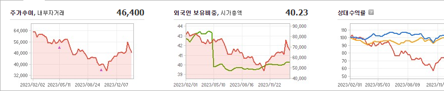 카카오페이의 현재 주가는 46,400원이며 전일 대비 -950원으로 하락하였습니다. 카카오페이의 주주 구성은 카카오(외 3인)이 지분 80.75%를 소유하고 있습니다. 카카오페이는 소비자 금융 기업으로, 현재 주식 시세는 46,400원입니다. 이 회사의 시가 총액은 6조 5,521억 원이며, 발행 주식수는 134,265,066주입니다. 외국인 보유 비중은 40.23%이며, 장중 거래량은 236,581주를 기록했습니다. 또한, 카카오페이는 4,492억 원의 매출액을 달성했습니다.