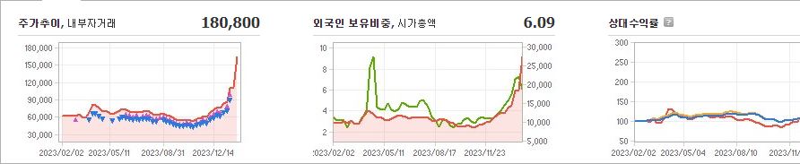 엔켐의 현재 주가는 180,800원이며 전일 대비 원의 모습을 보이고 있습니다. 주주현황을 살펴보면 오정강(외 3인)이 지분의 24.75%를 소유하고 있습니다. 엔켐은 전자 장비 및 기기 기업으로, 장중 기준으로 주가는 180,800원입니다. 시가 총액은 3조61억 원이며 발행 주식수는 17,098,001주입니다. 외국인 보유 비중은 6.09%이며 장중 거래량은 1,537,283주를 기록했습니다. 또한, 매출액은 3,729억 원을 달성했습니다.