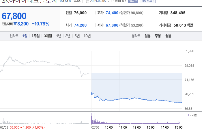 SK아이이테크놀로지는 현재 주가가 76,000원이며 전일 대비 -6.06원 하락한 상태입니다. SK아이이테크놀로지의 대주주는 SK이노베이션(외 4인)으로, 지분 비율은 61.20%입니다. 이 회사는 전자 장비 및 기기 기업으로 분류되며, 현재 주식의 시가 총액은 4조 8340억 원이고 발행 주식수는 71,297,592주입니다. 외국인의 보유 비중은 10.76%이며, 장중 거래량은 424,939주입니다. 또한, 매출액은 4,771억 원을 기록했습니다.