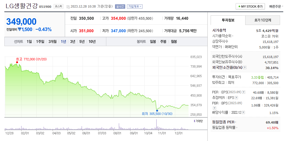 LG생활건강 현재 주가는 350,500원이며 전일 대비 -21.50원의 모습을 보이고 있습니다. LG생활건강의 주주현황을 살펴보면 LG(외 1인)이 지분 34.04%를 소유하고 있습니다. LG생활건강는 개인생활용품 기업으로 장중 기준으로 주가는 350,500원 입니다. LG생활건강의 시가 총액은 5조4351억 원이며 발행 주식수는 30.14주 입니다. 외국인 보유 비중은 29,744% 이며 장중 거래량은 15,618,197를 기록했습니다. 매출액은 52,376억 원, 영업이익은 7,111억 원을 달성했습니다. EPS는 15,381원이며 LG생활건강 주식 배당수익률은 0.55% 입니다.