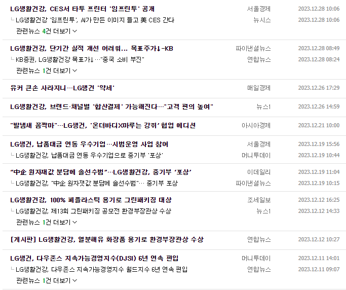 -동사는 2001년 4월 LG화학에서 분할 신설되어 유가증권시장에 상장됨. 화장품 및 생활용품, 음료 등을 제조, 판매 사업을 영위하고 있음. Beauty 사업부문은 '더후', '숨37˚', '오휘', '빌리프', 'CNP', '더페이스샵(TFS)' 등 다양한 럭셔리 및 프리미엄 브랜드를 보유하고 있음. HDB 사업부문은 동사의 가장 오래된 사업으로서 국내 시장에서 굳건한 1위 지위를 차지하고 있음.