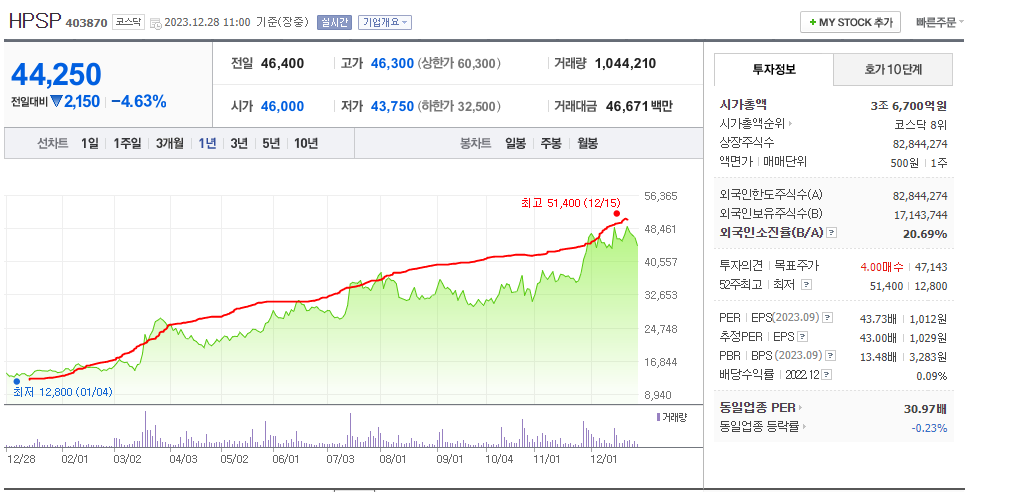 HPSP 현재 주가는 46,400원이며 전일 대비 -500원의 모습을 보이고 있습니다. HPSP의 주주현황을 살펴보면 한미반도체(외 1인)이 지분 39.59%를 소유하고 있습니다. HPSP는 반도체 및 관련장비 기업으로 장중 기준으로 주가는 46,400원 입니다. HPSP의 시가 총액은 3조7197억 원이며 발행 주식수는 20.69주 입니다. 외국인 보유 비중은 1,708,226% 이며 장중 거래량은 82,844,274를 기록했습니다. 매출액은 1,486억 원, 영업이익은 852억 원을 달성했습니다. EPS는 1,028원이며 HPSP 주식 배당수익률은 0.28% 입니다.