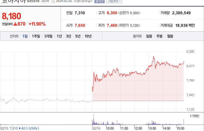 코아시아 주가