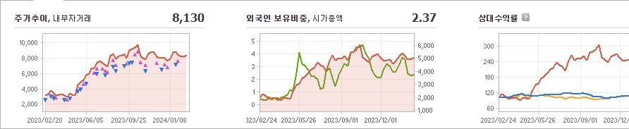 실리콘투는 온라인쇼핑 기업으로 현재 주가는 8,130원이고 전일 대비 -40원의 하락세를 보이고 있습니다. 주주현황을 살펴보면 김성운(외 7인)이 지분 44.36%를 소유하고 있습니다. 시가 총액은 6111억 원이며 발행 주식수는 60,389,234주입니다. 외국인 보유 비중은 2.37%이며 장중 거래량은 372,795주를 기록했습니다. 매출액은 2,372억 원입니다.