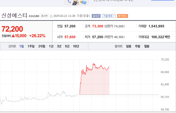 신성에스티의 현재 주가는 57,200원이며 전일 대비 원의 모습을 보이고 있습니다. 주주현황을 살펴보면 신성델타테크(외 8인)이 지분 58.82%를 소유하고 있습니다. 신성에스티는 전자 장비 및 기기 기업으로, 장중 기준으로 주가는 57,200원입니다. 시가 총액은 6445억 원이며 발행 주식수는 9,039,778주입니다. 외국인 보유 비중은 1.07%이며, 장중 거래량은 1,128,830주를 기록했습니다. 또한, 매출액은 억 원을 달성했습니다.