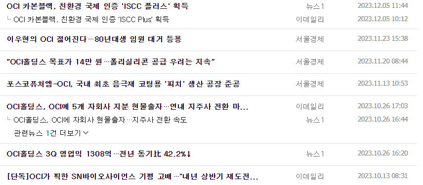 -동사는 인적분할하여 설립된 신설회사로 분할 전 회사인 OCI홀딩스의 사업부문을 분할하여 2023년 5월 변경상장 및 재상장함. 주요사업으로는 베이직케미컬 및 카본케미컬 사업을 영위중이며 안정적인 기초화학 소재 사업을 바탕으로 반도체 및 2차전지 소재 사업 확대를 추진하고 있음. 베이직케미컬 부문의 대표제품은 폴리실리콘과 과산화수소가 있으며 카본케미컬 대표제품은 카본블랙, 핏치 등이 있음.